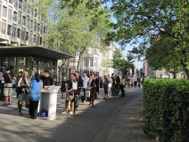 It completely dominates a very nice green square (Grosvenor) that has some very nice-looking embassies for other countries. Luckily for the aesthetics of the square, the US Embassy is primarily hidden by trees. The trees are London plane trees and they are giving off masses of pollen, so everyone in line is sneezing up a storm. “What’s with this park?” an American man behind me says between sneezes.