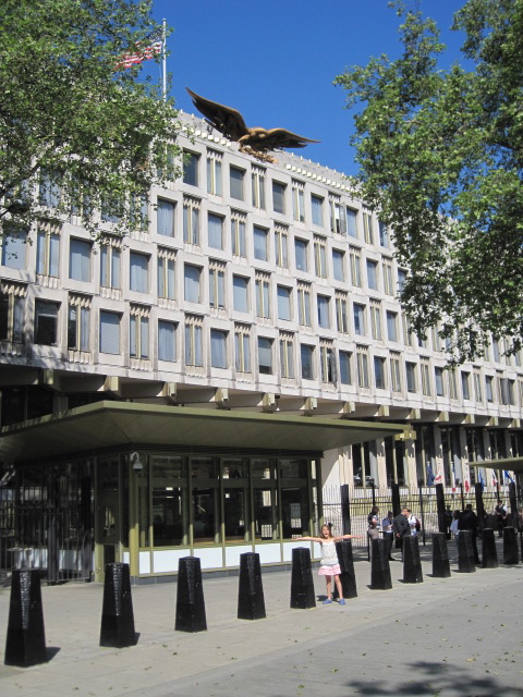 As we got to the front of the line outside the Embassy, the woman on duty demanded “Passport!”, so I showed her Meg’s. The woman said, “I need the passport of the responsible adult,” and I handed her my passport saying, “If I were the responsible adult, we wouldn’t have to be here!” meaning here in line in London after Meg’s passport had already expired when I could have done it months ago via mail in America.